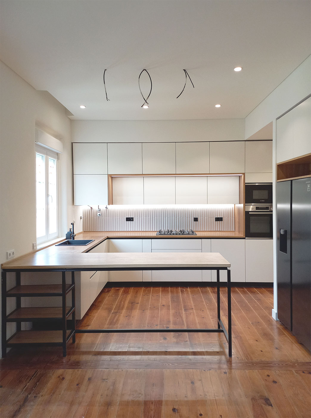 A cozinha e as zonas sociais foram redesenhadas como espaços mais abertos e fluidos, promovendo a vivência da casa no dia-a-dia. O desenho de mobiliário fixo e a atenção ao detalhe contribuíram para um resultado coeso e intemporal.
