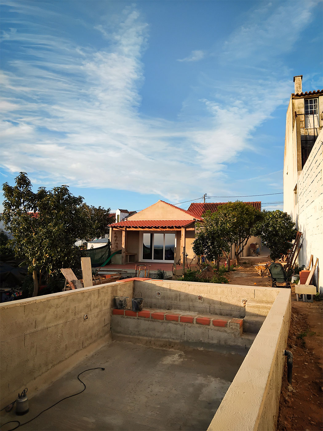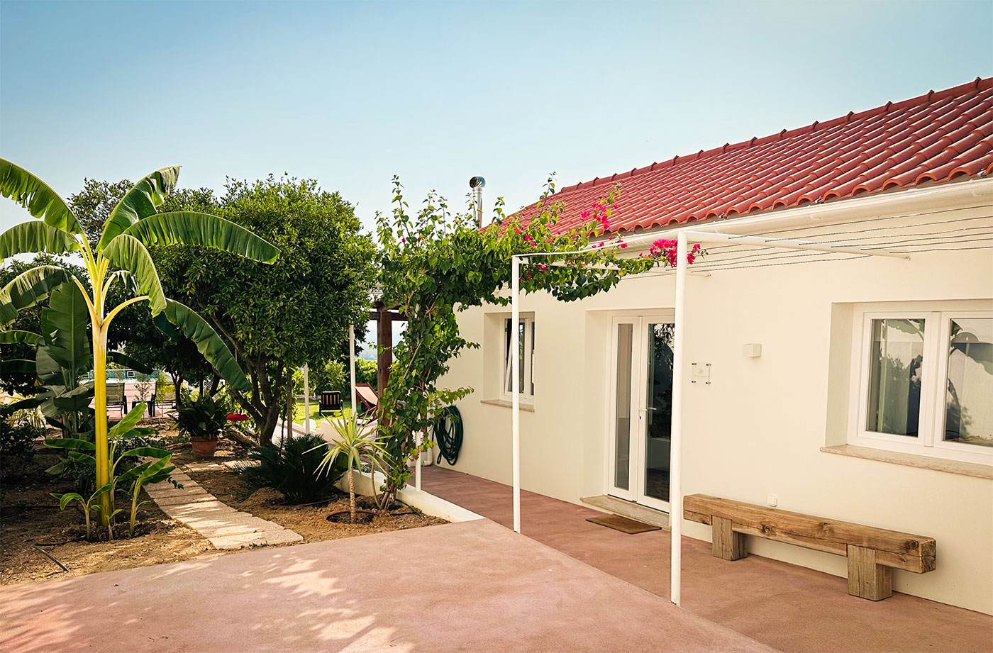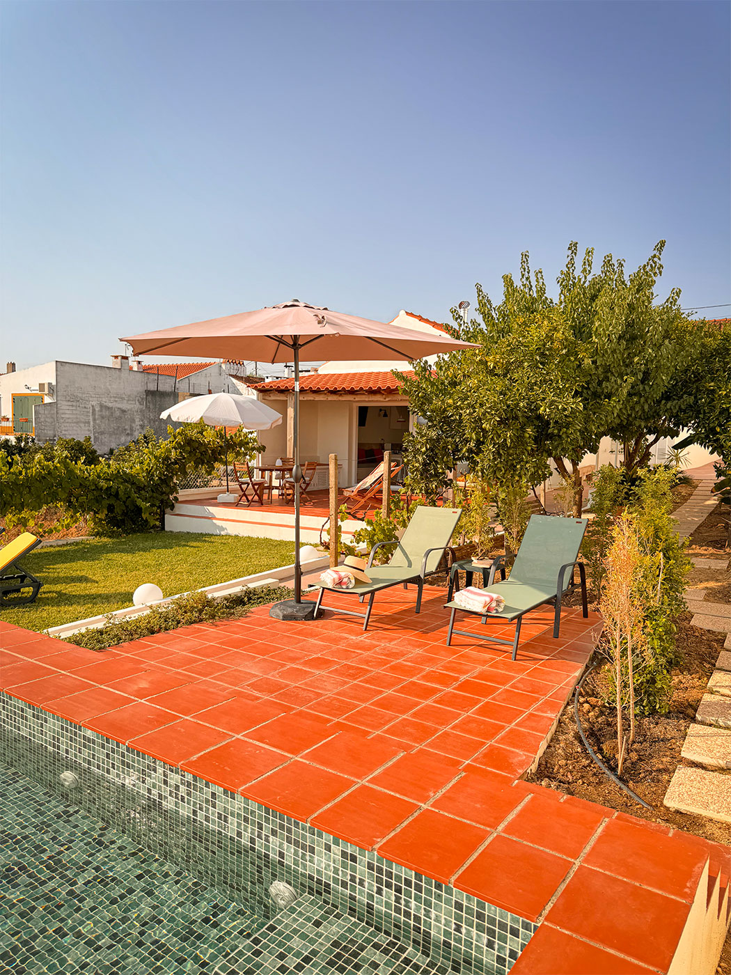 No exterior, a introdução de uma piscina sobre a encosta reforça esta ligação ao território, funcionando como extensão do espaço habitável e como ponto de contemplação sobre a paisagem.