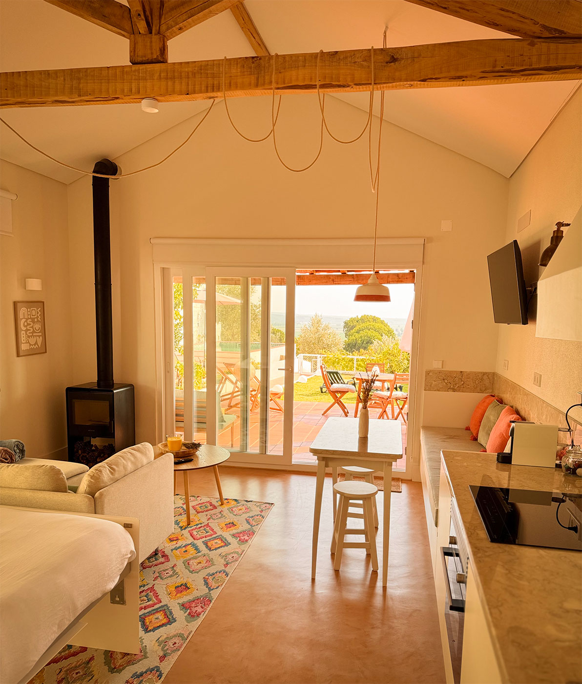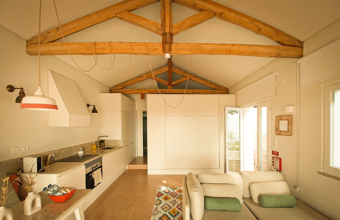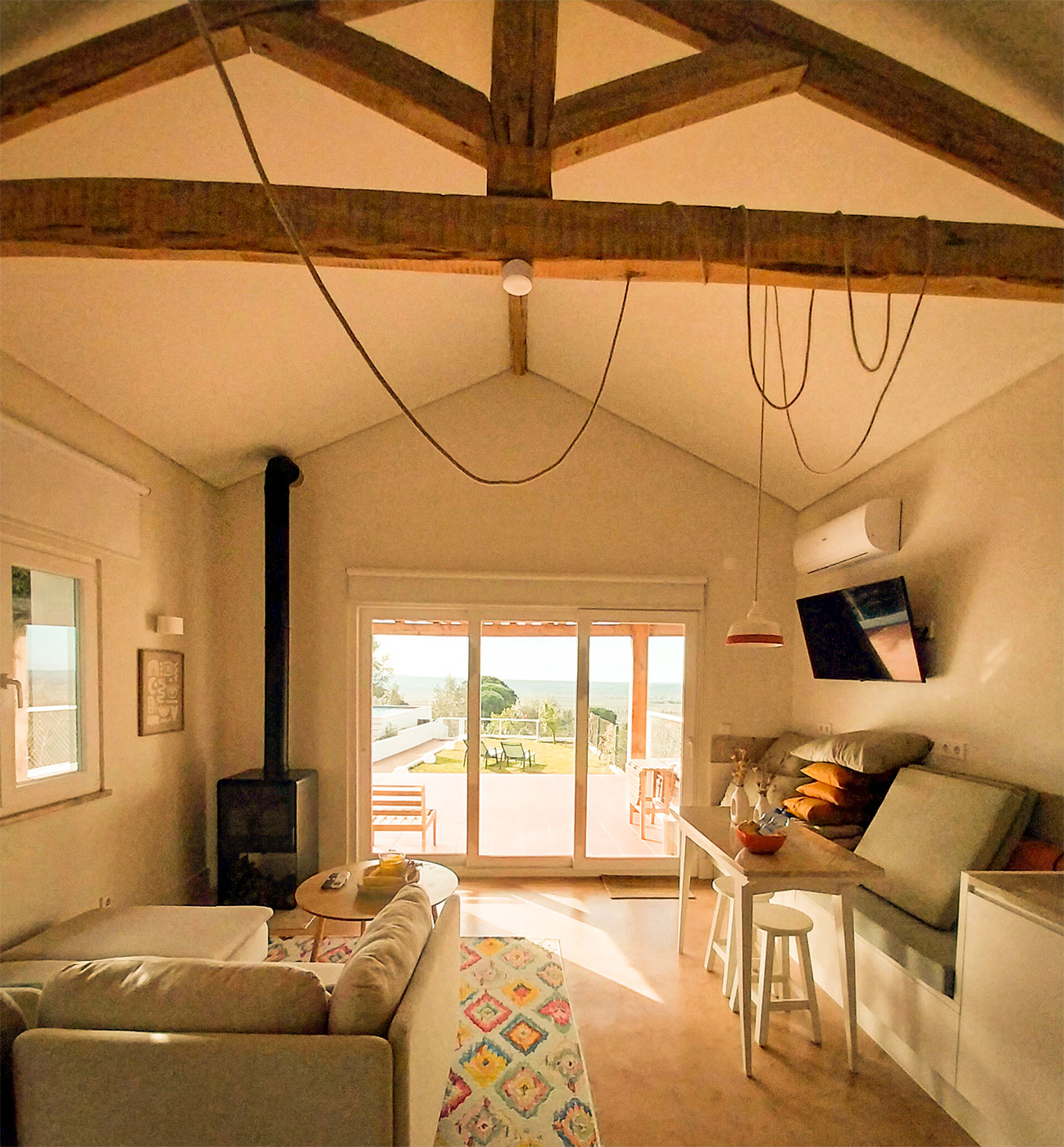O programa foi reorganizado para criar espaços amplos e luminosos, com especial atenção à relação entre interior e exterior, tirando partido da posição privilegiada do terreno. A abertura de vãos e a continuidade visual permitem enquadrar a paisagem da lezíria como elemento central da vivência da casa.