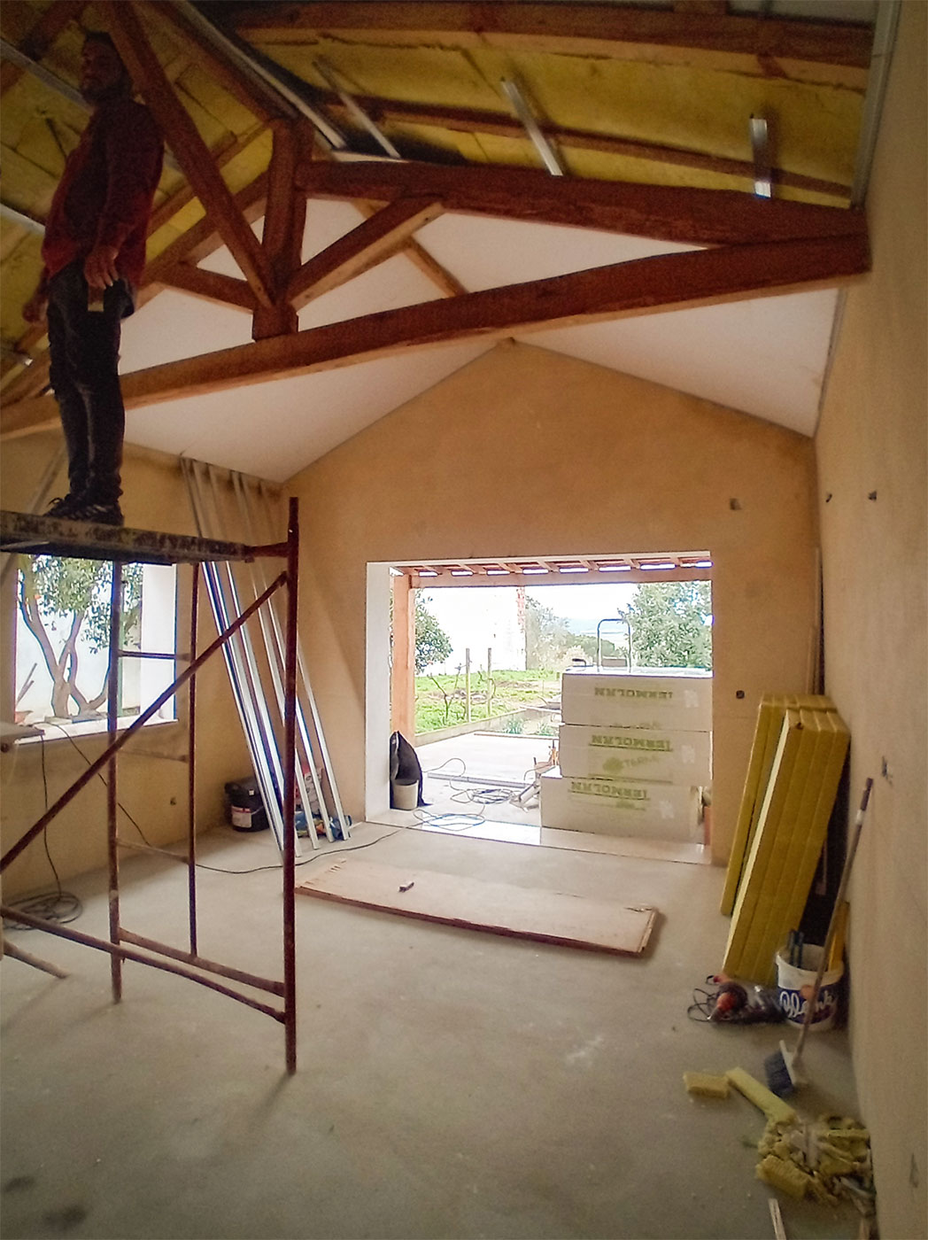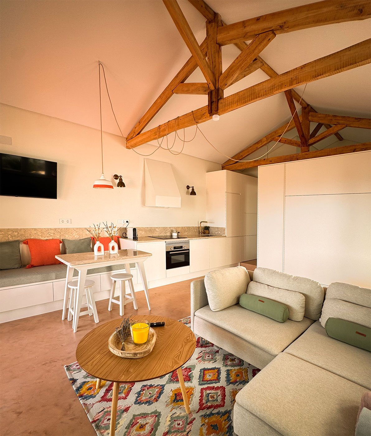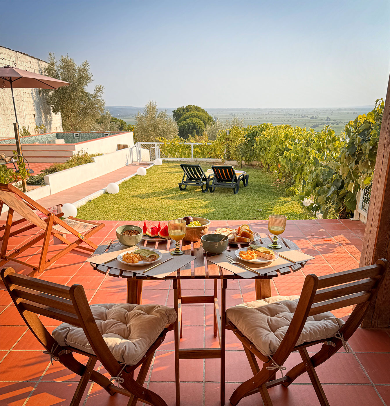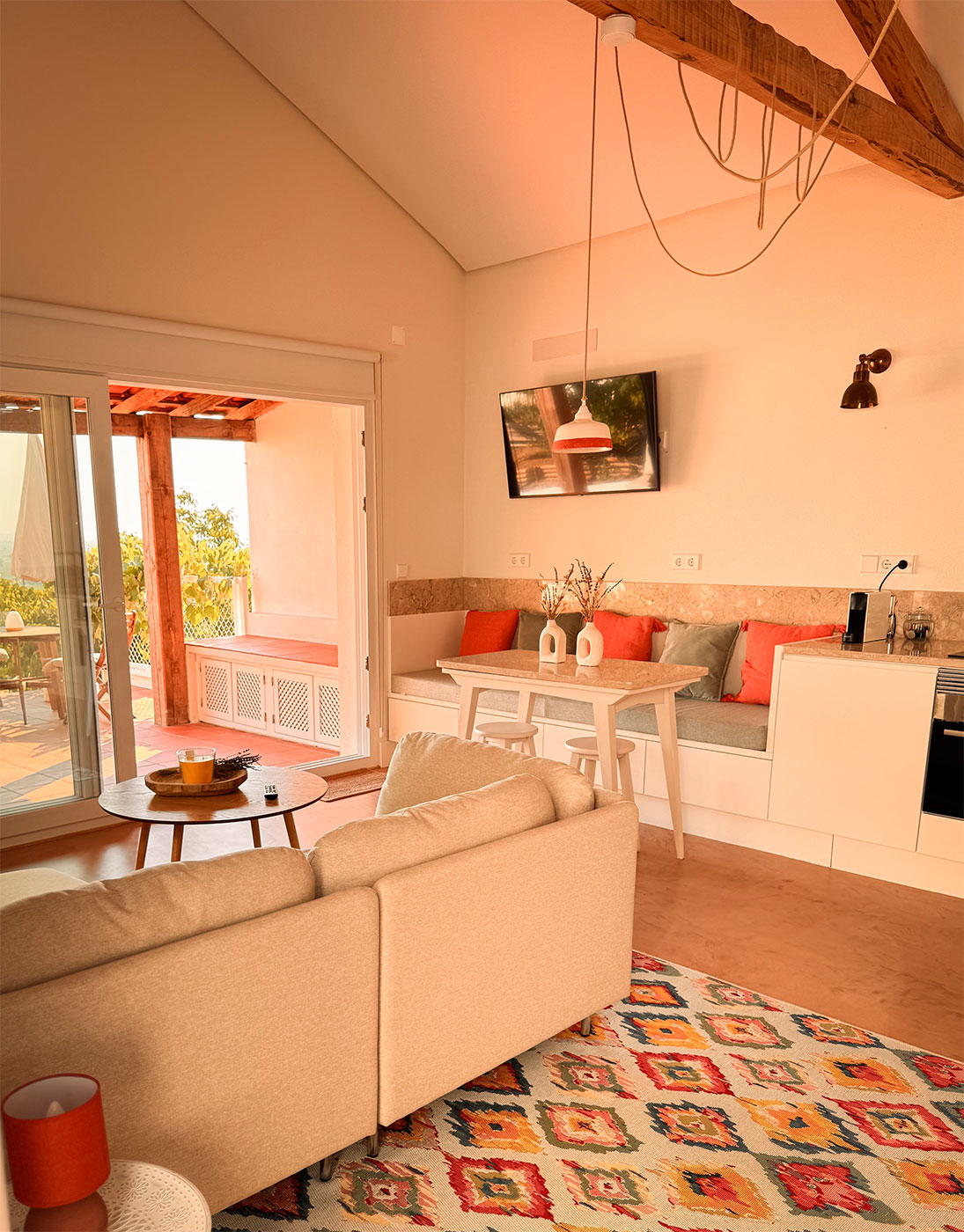 O programa foi reorganizado para criar espaços amplos e luminosos, com especial atenção à relação entre interior e exterior, tirando partido da posição privilegiada do terreno. A abertura de vãos e a continuidade visual permitem enquadrar a paisagem da lezíria como elemento central da vivência da casa.